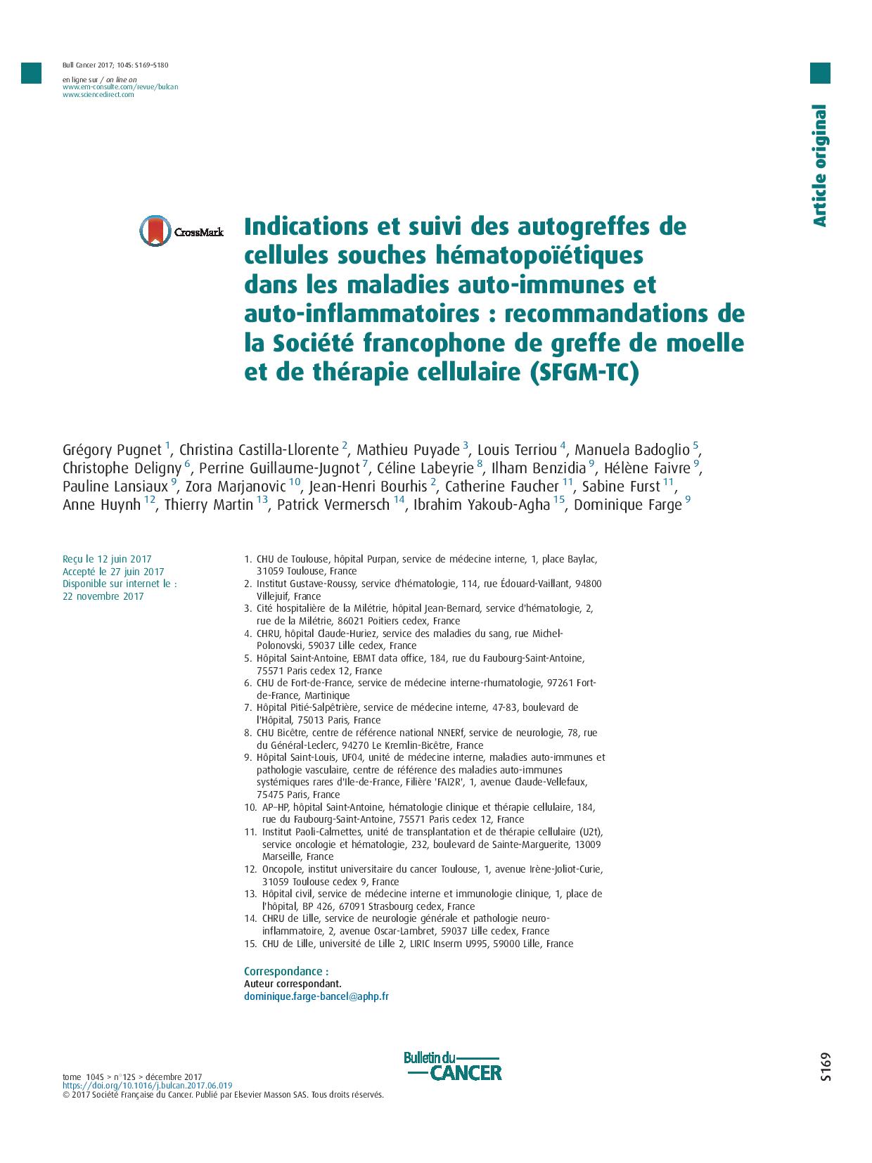 Indications des suivis des autogreffes de cellules souches hématopoïétiques dans les maladies auto-immunes